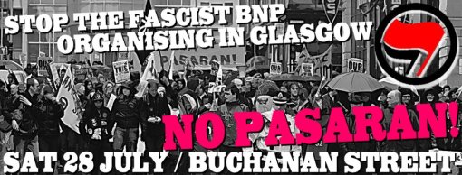 On Saturday 28 July, the BNP will descend on Glasgow city centre for what leader Nick Griffin is calling the “biggest nationalist demonstration ever in Glasgow”. It follows their failed attempts – alongside their fascist chums in the Scottish Defence League – to carry out activity on Buchanan Street over two Saturdays in July so far. On both occasions, passers by and local anti-fascists have united to show their opposition to the BNP and SDL – and they were soon sent packing. Saturday 28th must be a huge show of force against the fascists – they shall not pass!