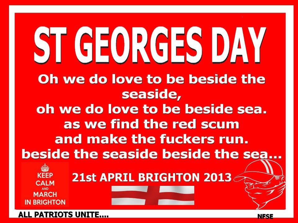 Oh Christ ..not again. About as welcome as the arrival of Jimmy Saville at an orphanage, it’s time for the outbreak of political venereal disease that is the March for England – set to tarnish the streets of Brighton again on April 21st. Following last year’s diverse, determined and ultimately effective opposition to the march, Brighton has become an emblematic issue on the far-right. They received a shock when a town they considered to be populated by communist homosexual freaks wasn’t the walkover they expected. The usual blood-curdling threats have been issued but nothing can conceal the panic on the far-right that Brighton will once again mount a succesful defence against racism and homophobia.