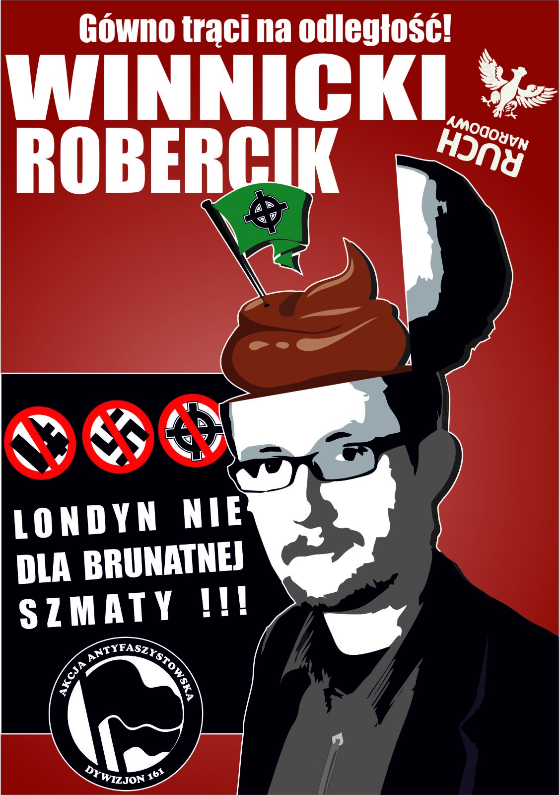 In the evening of 27 October, a group of about 30 people decided to go to a meeting and listen to what he has to say Robert Winnicki . When we arrived at the parish in Putney surprised us a view of dozens of nationalists defending the gates of the building and politely talking with police officers, after which it turned out they called themselves. The police informed us that the meeting was officially cancelled and that we have no business here. Despite assurances by the police decided to stay and loudly express our opinion on the Winnicki and hypocrisy Polish nationalists in exile. We have developed a banner “I do not pretend fascists angels” (with a picture of Winnicki in the brown uniform with angel wings in a crossed red circle) and began to przekrzykiwania the fascists defending the gate. Our opponents pulled out a green flag with a hand holding something like a penis. We learned that we are “minions of the system” (despite the fact that he encourages RN denucjowania the police nationalists from other groups, and the organiser of the meeting is Patriae Fidelis – powdered nationalist group – supporters of the capitalist regime), we also found out that the proponents do not Winnicki are racists, but they let slip a few times to “Pull dick niggers” (it was the fact that among us there were two Englishmen with dark skin who came to see the Polish zoo) or sexist when they started challenge our friends from “rags” . On their side counted until one woman (you can see their place in the national ideology). In the presence of the police fascists began to provoke and encourage us to attack, for the same answer did not respond, despite being outnumbered in the form of up to their peers. There were two clashes – when in the middle of the street there was a debate – in spite of a larger group of two fascists got in the snout, and the rest withdrew, and when I met a group of anti-fascists bonheadów reaching the meeting – quickly fled in the direction of the police. As you can see the spirit of the nation is not lost!