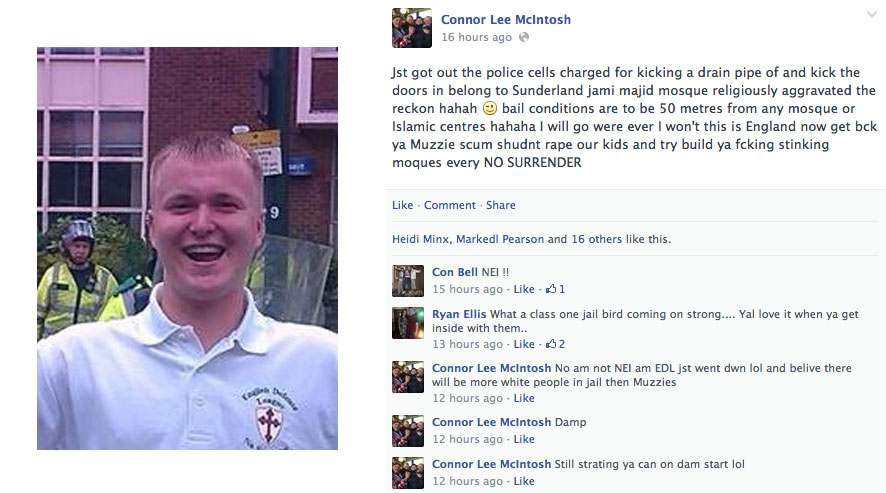 In an illustrative incident from Sunderland, EDL member Connor Lee McIntosh was arrested for attacking a Mosque. His comments below very clearly show their unrepentant racism.