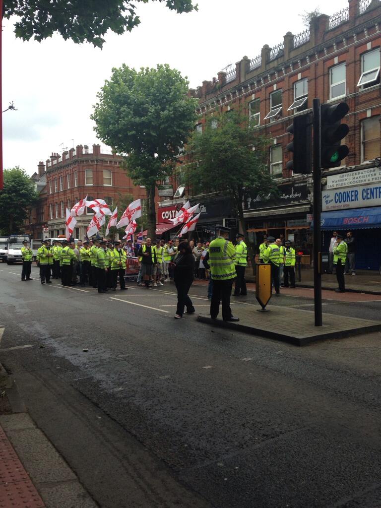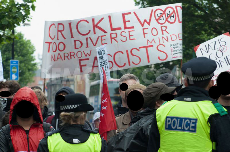 Faced with a large and resolute crowd the police initially stopped the SEA about 20 metres from the anti-fascist crowd. There the fascists remained while plod scratched their heads for a bit, before finally deciding abandon the whole thing. To cheers and shouts of ‘goodbye – don’t come back!’ from the anti-fascists, the SEA were turned around and sent back the way they had come, without ever having got to the supposed destination of their demo. They were taken back to Kilburn station and removed from the area.