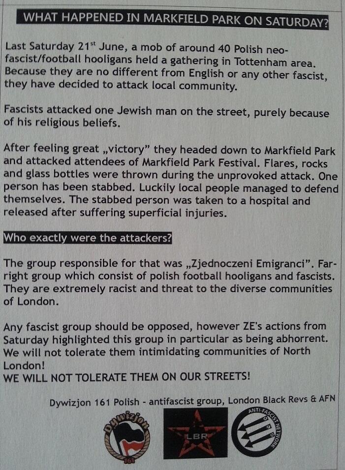 On Saturday a group of Polish neo-Nazis from the group Zjednoczeni Emigranci (ZE – United Immigrants) attacked the small ‘Music Day’ festival in Markfield Park in Tottenham, North London assaulting a Jewish man and stabbing another Polish man. This pre-planned and unprovoked attack on a family music festival was carried out by a group of about 40 fascists and involved throwing glass bottles, stones and flares. Several other people were injured.