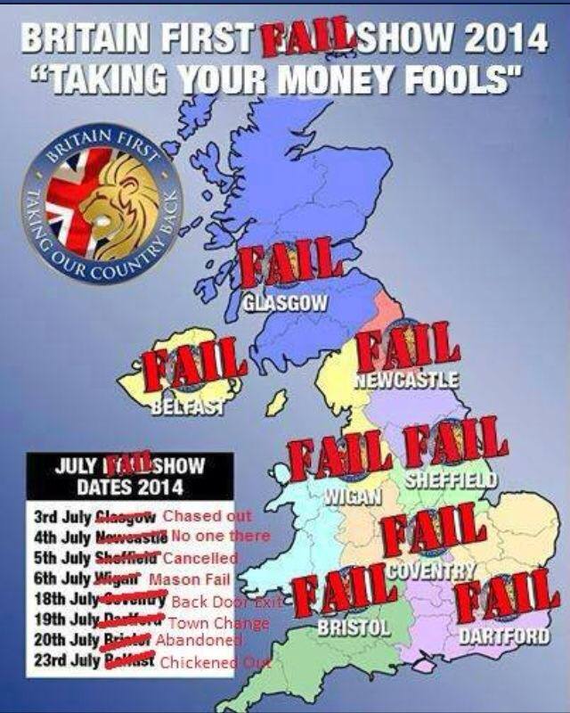 Britain First looked like a slick professional outfit and appeared to be on a roll with hundreds of thousands of Facebook followers, until they were stripped of 150,000 of them for purchasing them from a click farm. Then they embarked on a ‘national roadshow’. This would seem like a natural move, but it only highlighted the gulf between their pretensions on social media and their lack of real-world support. None of their meetings across the country attracted more than 20 people, and that’s including the goon squad they brought with them. They faced opposition from anti-fascists almost everywhere they went and had their venues cancel on them in Sheffield and Dartford. Eventually they just abandoned the whole thing, cancelling gigs in Bristol and Belfast that were supposed to be the culmination of their tour.