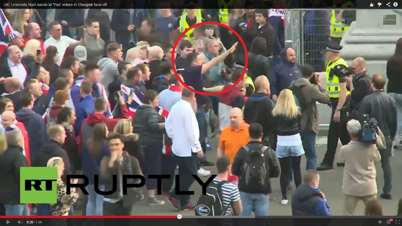 A loyalist protester nazi-salutes. Screencap taken from this video.