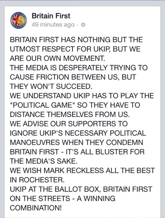 Britain First have been out ‘campaigning’ fash-style in Rochester – on Saturday they harassed some people in a local mosque and then got their photo taken being pally with the UKIP candidate, which forced UKIP into distancing itself from Britain First.