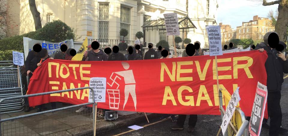 On Saturday, around 30 fascists from several groups including New Dawn (an English Golden Dawn supporters group), NOP England (the ex-pats division of a notorious Polish neo-nazi group) and a few others held a demo in front of the Greek Embassy in London, supposedly in support of jailed members of GD.