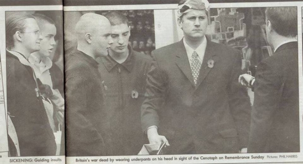 Paul Golding in earlier years with underpants on his head at the Cenotaph on Remembrance Sunday