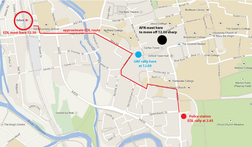 It’s only an hour from Oxford to London – members of the EDL may be planning on attending the PEGIDA demonstration later in the day. Anti-fascists should consider doing likewise and making a double-whammy of a day.