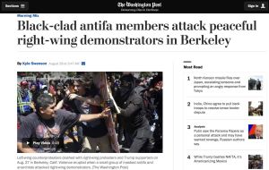 The Washington Post titled their coverage of Sunday’s demonstration “Black-clad antifa members attack peaceful right-wing demonstrators in Berkeley.” It is not surprising when Fox News publishes barefaced propaganda describing the organizer of far-right demonstrations that have included at least one fascist murderer as a “prayer activist,” but it is more unsettling to see fascist talking points parroted by supposedly liberal outlets.
