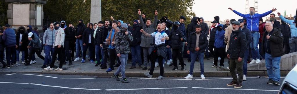 Despite this shit-show, the right-wing media have been desperately back-pedalling from the mess that they created with their lurid tales of how Muslamics were coming to attack Remembrance Day. Sunday’s papers immediately pivoted to spinning the day as a tale of ‘both sides’ extremism. This however, doesn’t appear to have been enough to save Braverman, and the whole farrago resulted in enough splits and recriminations amongst the Tories to lead to her (thankfully!) getting the boot. Although some of the Cenotaph-defenders may have thought they had a top day out, we can hope that the generally shambolic nature of the proceedings may also result in some accusations and fallings-out among the ‘patriots’ too. Tommy Robinson may have lost a little more of his waning street cred and the chances of any EDL rebirth may be thankfully a little further away. Unfortunately however, these events may work to the benefit of those elements of the far-right that kept their distance from Saturday’s shambles, notably Patriotic Alternative, who like to present a more ‘disciplined’ image.