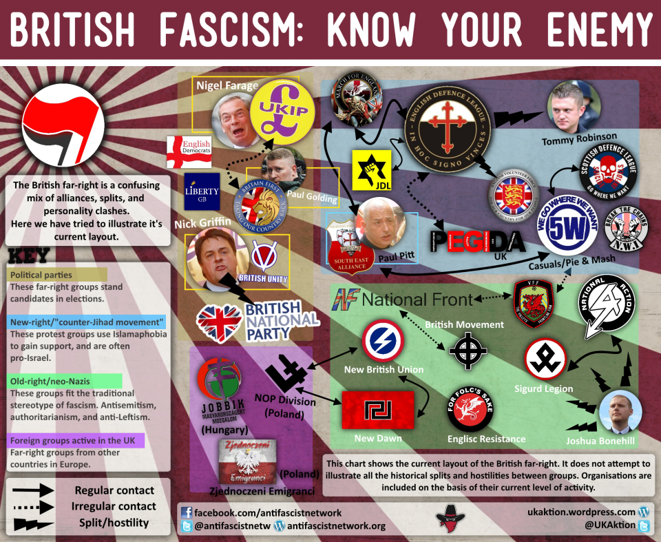 This is the second in the series of UK Aktion infographics looking at the British far-right. This time: the EDL in focus. We have tried to illustrate the main groups and people that went into founding the EDL, as well as the larger, and more active splinter-groups to come from them. Obviously, we could not include every group but this is an attempt to chart the main ones. Below is a high quality .PNG file. Please feel free to download and share.